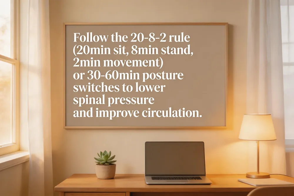 Prolonged sitting compresses lumbar discs and weakens core stabilizers can overload knees, hips and the circulation. research evidence (Family Chiropractic, UCLA Health, Mayo Clinic) shows that alternating posture every 30‑60 minutes reduces spinal pressure and musculoskeletal discomfort. A practical micro‑break schedule is the 20‑8‑2 rule: 20 minutes of sitting, 8 minutes of standing, followed by 2 minutes of light movement (marching, calf raises, neck rolls). Repeat this cycle to keep blood flowing and avoid joint strain. Start with 30‑minute standing blocks and gradually build to a total of 1‑2 hours per day, split into several sessions; many clinicians recommend up to four hours once the body adapts. Proper ergonomics are essential—desk height so elbows are at a 90‑degree angle, monitor top at eye level, feet shoulder‑width apart, knees slightly bent, and an anti‑fatigue mat or supportive shoes. Micro‑breaks every 20‑30 minutes (or the 20‑8‑2 pattern) and brief walks prevent stiffness, protect the lower back, and promote overall wellness.