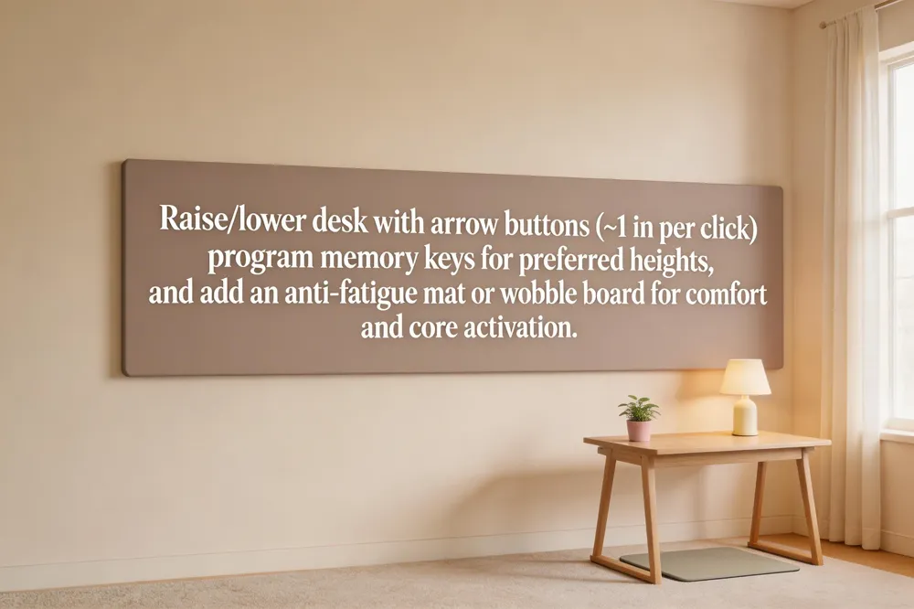 Press the up‑arrow to raise, down‑arrow to lower, each click moving the surface ~1 in. Adjust until elbows at a 90‑degree angle and the monitor top at or slightly below eye level. If your desk has programmable memory keys, hold the desired button until “saved” appears, then tap to recall the saved height. Engage the lock or hold button before typing to prevent accidental movement. For error codes, hold the down‑arrow for five seconds until “RST” flashes and follow reset instructions.