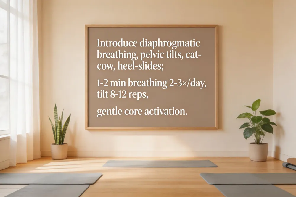 Begin with diaphragmatic breathing and pelvic tilt (8‑12 reps) while lying on your back, keeping the abdominal wall flat against the floor. Progress to cat‑cow stretches and heel‑slide pelvic tilts, then add gentle bridges (hold 6 seconds). Avoid “doming” the belly; instead draw the belly button toward the spine. If a diastasis gap is >2 cm, limit forward‑flexion moves and prioritize transverse‑abdominis bracing.