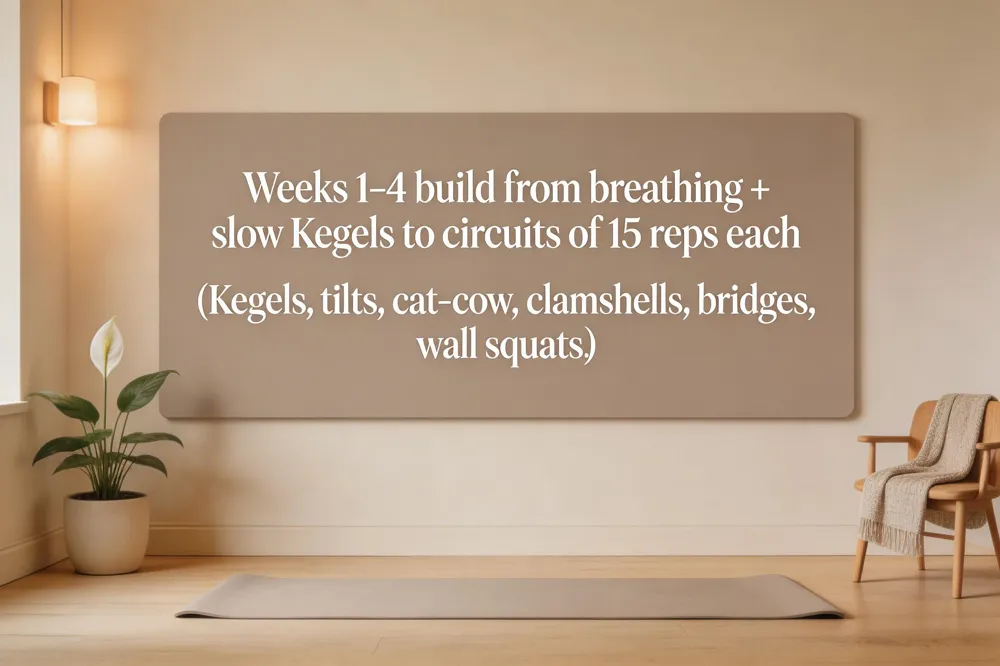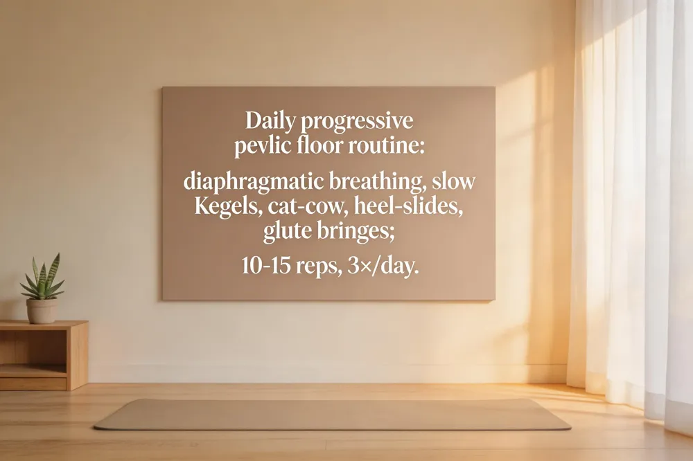 Postpartum pelvic floor exercise plan – Begin each day with 5–10 minutes of diaphragmatic breathing while lying on your back, then perform gentle pelvic tilts (8‑12 reps, 6‑second hold). At 6‑8 weeks postpartum, after provider clearance, add Kegels: contract as if stopping urine flow, hold 3‑5 seconds, relax 10 seconds, 10‑15 repetitions, three times daily. Include cat‑cow stretches and heel‑slide tilts to link spinal mobility with deep core activation. Best pelvic floor exercises for new moms – The core routine is slow & fast Kegels, pelvic‑tilt/heel‑slide, bridges, wall squats, and clamshells. Aim for three sets per day, gradually increasing hold time toward 10 seconds. 4‑week routine – Week 1: breathing + 10‑15 slow Kegels + 8‑10 pelvic tilts. Week 2: add cat‑cow (10‑12 cycles) and basic bridges (8‑10 reps). Week 3: increase to 12‑15 Kegels, 12‑15 tilts, heel‑slides per leg, and wall squats (12‑15 reps). Week 4: circuit of 15 Kegels, 15 tilts, 15 cat‑cow cycles, 15 clams per side, 15 bridges, 15 wall squats; repeat 2‑3 rounds, 20‑30 minutes total, three times weekly. Home practice – Perform the above at home after your 6‑8 week check‑up, staying hydrated and avoiding high‑impact activity until after 12 weeks. Stop any movement that causes pain and consult a pelvic‑floor therapist for personalized guidance.