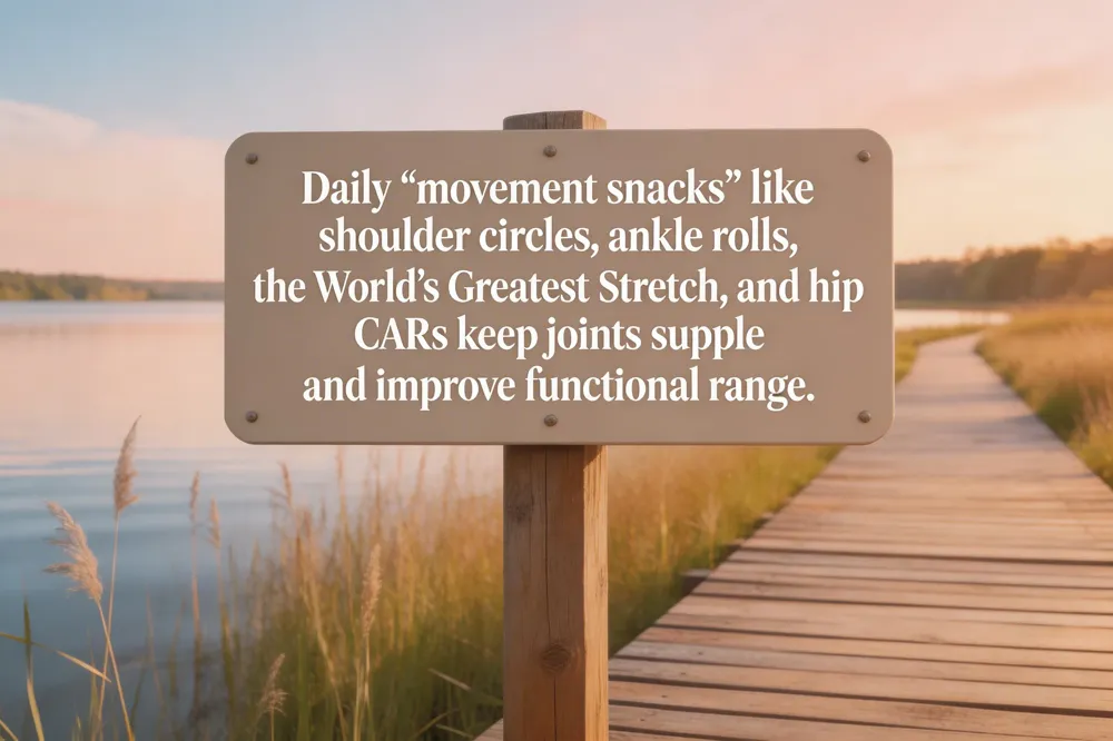 A quick, daily "movement snack" can keep joints supple and prevent stiffness without taking up much time. Start with dynamic joint‑specific drills—shoulder circles, neck rotations, and ankle circles to warm the surrounding and improve circulation. Then move into a full‑body circuit such as the World's Greatest Stretch, 90/90 Hip Switch, Cat‑Cow, and Downward Dog Hip Opener; each exercise guides the joint through its functional range while engaging the muscles that stabilize it.
