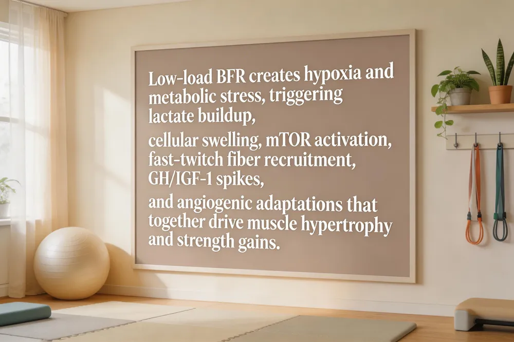 The metabolic milieu triggers the mTOR signaling pathway, a central regulator of muscle protein synthesis, and also promotes early recruitment of fast‑twitch (type II) fibers even at loads of only 20‑30 % of 1RM. This recruitment pattern mimics high‑load resistance training, allowing comparable hypertrophy and strength gains.