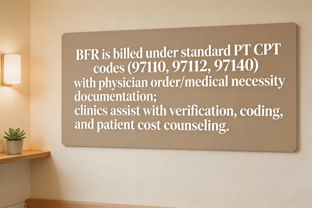 Blood‑flow‑restriction (BFR) therapy is usually billed as part of a standard physical‑therapy visit rather than as a separate line item. The most common CPT codes are 97110 (therapeutic exercises), 97112 (neuromuscular re‑education) and 97140 (manual therapy) when BFR is incorporated into those services. A physician’s order or a documented medical‑necessity note is often required, especially for insurers that demand proof that BFR is appropriate for the patient’s diagnosis (e.g., post‑operative ACL reconstruction or osteoarthritis). Our clinic’s staff assists patients by reviewing their plan, submitting the appropriate CPT codes, and providing any supplemental documentation the payer requests. If a plan has specific limitations, we inform the patient upfront, help obtain the required physician order, and discuss any potential out‑of‑pocket costs. In short, BFR is typically covered as part of a PT session, but verification with the insurer and clinic support are essential.