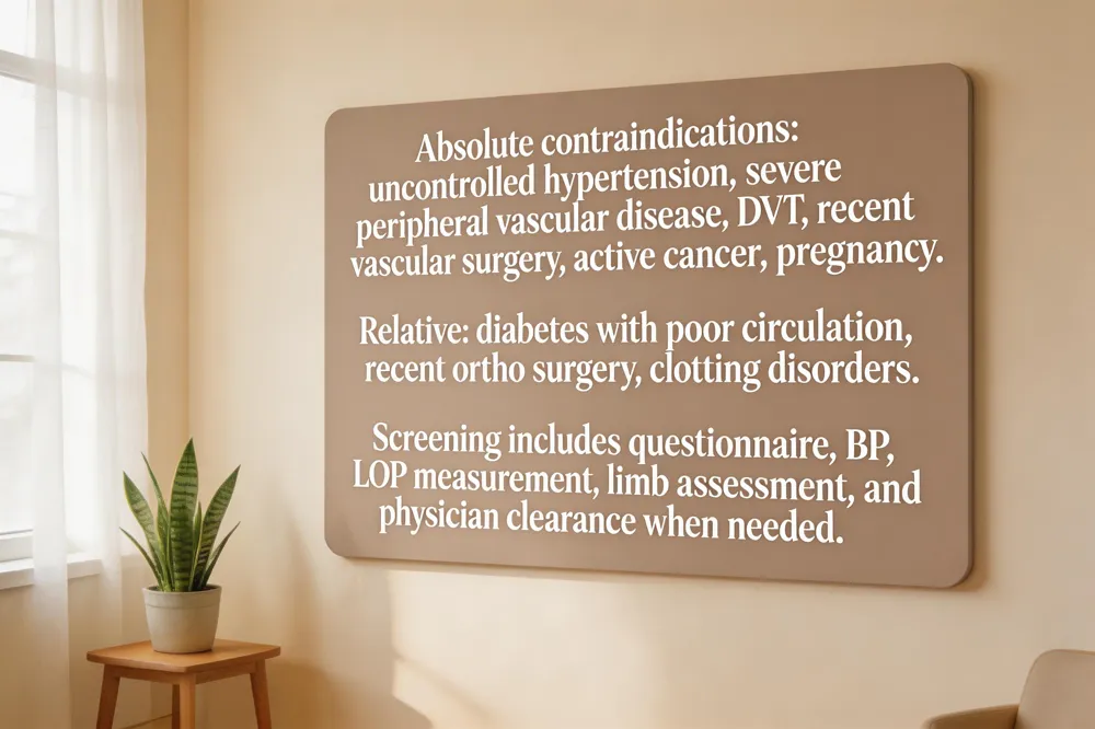 Absolute contraindications include uncontrolled hypertension (systolic ≥ 180 mmHg), severe peripheral vascular disease, active deep‑vein thrombosis, recent graft or vascular surgery, active cancer, and pregnancy. Relative contraindications—requiring physician clearance—are diabetes with poor circulation, recent orthopedic surgery (< 12 weeks), clotting disorders, and chronic kidney disease. Our therapists conduct a thorough medical‑history review to identify any of these risk factors before BFR is prescribed.
