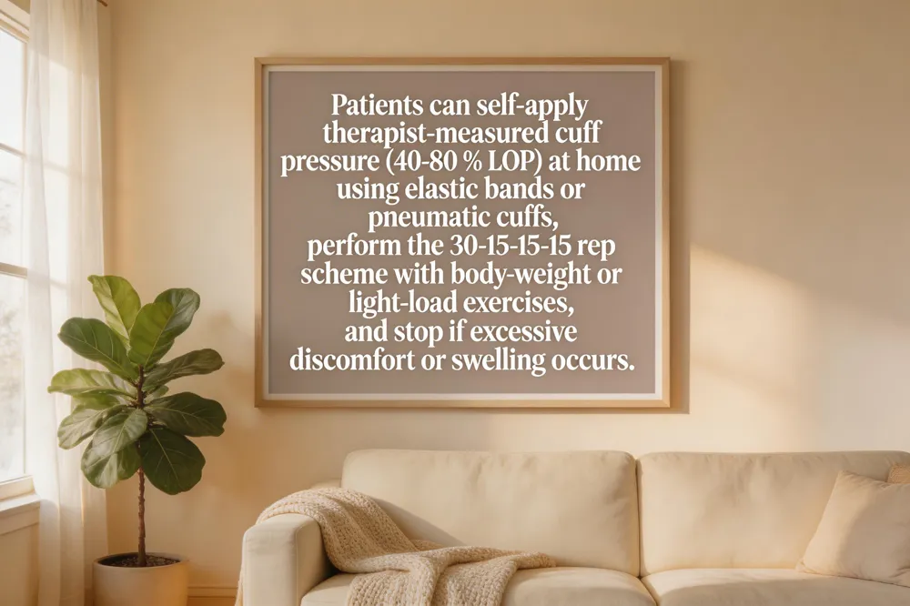 Therapist‑prescribed elastic bands or pneumatic cuffs can be used safely at home once a qualified clinician has measured your limb occlusion pressure and selected the appropriate cuff width. The therapist will show you how to place the cuff proximally on the upper arm or thigh, tighten it to 40‑80 % of your individual arterial occlusion pressure, and confirm that arterial flow remains while venous return is partially restricted. Low‑load exercises such as body‑weight squats, seated leg extensions, light dumbbell curls, or standing calf raises are ideal for home use; the classic 30‑15‑15‑15 rep scheme (≈75 repetitions) with 30‑60 seconds rest between sets provides sufficient metabolic stress without heavy loading. While training, monitor for any excessive pain, numbness, tingling, or swelling; if any of these symptoms appear, release the cuff immediately and contact your therapist. Consistent self‑monitoring and adherence to the prescribed pressure and exercise protocol enable you to gain strength and muscle size while protecting joints and promoting a pain‑free return to daily activities.