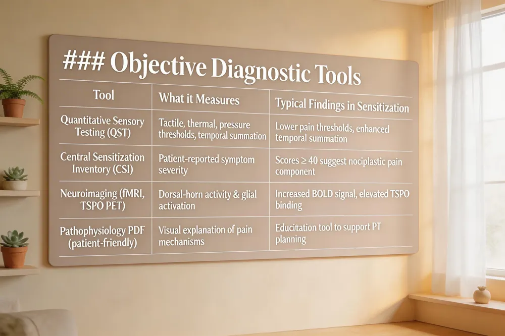 Quantitative Sensory Testing (QST) – A standardized series of tactile, thermal, and pressure stimuli that maps pain thresholds and temporal summation. Abnormal QST results reveal peripheral and central hyper‑excitability, supporting a diagnosis of sensitization.
