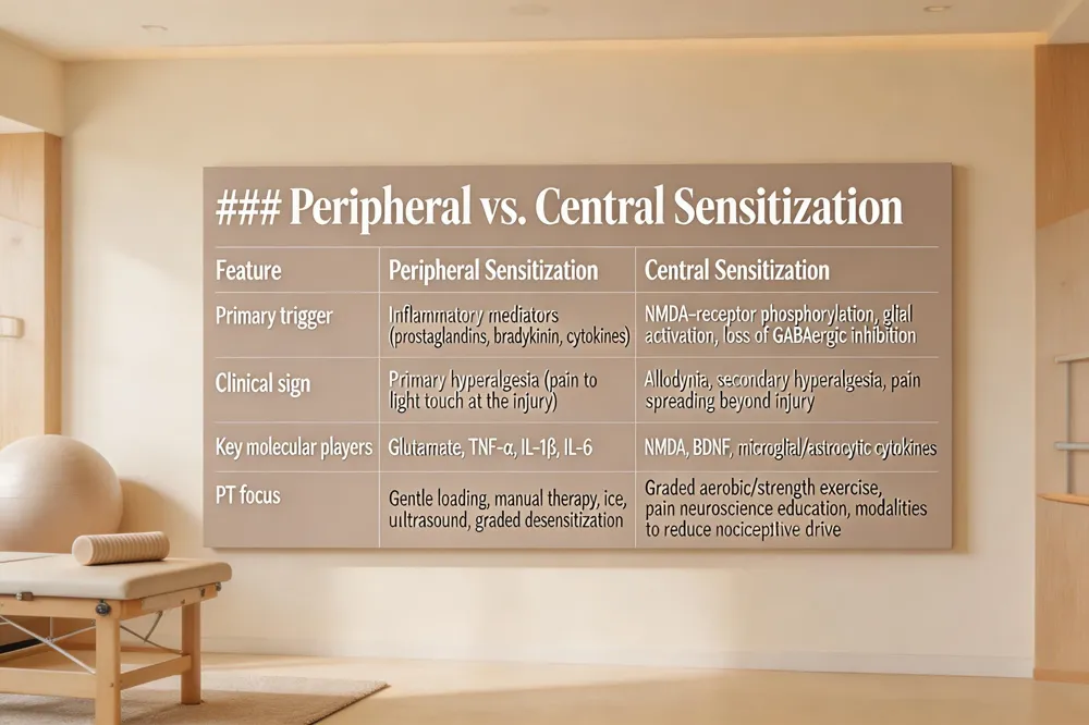 Pathophysiology of Pain (PDF) – Chronic pain starts with peripheral sensitization driven by inflammatory mediators and ion‑channel dysregulation, then spreads to spinal and supraspinal circuits via NMDA‑mediated wind‑up, glial cytokines, and loss of inhibitory control. Our patient‑friendly PDF explains these steps and how targeted physical‑therapy interventions can interrupt them.