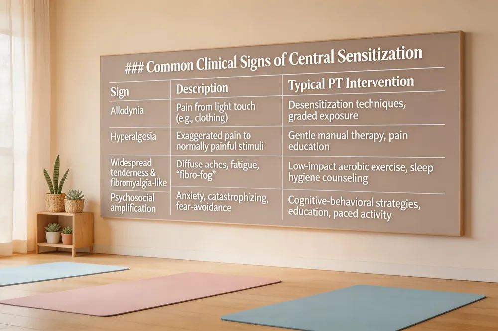 | Patients with central sensitization often present with a constellation of signs that go beyond the original injury site. Allodynia and hyperalgesia appear as pain from light touch (e.g., a shirt brushing the skin) or an exaggerated pain response to normally painful stimuli, such as a mild pinch. Widespread tenderness and fibromyalgia‑like symptoms include diffuse body aches, headache, gastrointestinal discomfort, and the classic “fibro‑fog" of fatigue, poor sleep, and difficulty concentrating. These symptoms can extend to non‑musculoskeletal systems, reflecting the nervous system’s heightened responsiveness. Psychosocial amplification is common; anxiety, catastrophizing, and stress increase the perception of pain and may trigger a cycle of fear‑avoidance behaviors that further perpetuate sensitization. |