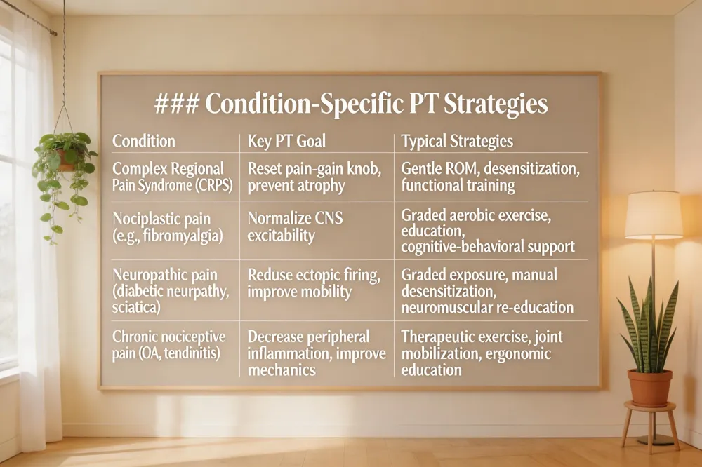 Nociplastic pain – This type of pain stems from central sensitization rather than tissue damage. Patients experience widespread pain, fatigue, sleep disruption, and heightened sensory sensitivity. PT focuses on pain neuroscience education, graded aerobic and strengthening exercise, and cognitive‑behavioral strategies to retrain the brain’s interpretation of sensory input and strengthen descending inhibitory pathways.