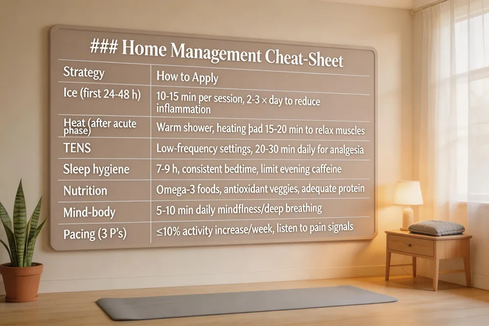 | Self‑care strategies – Simple modalities such as heat, ice, and a low‑intensity TENS unit can dampen nociceptive input without masking the nervous system’s need to reset. Apply ice for the first 24‑48 hours after a flare to reduce inflammation, then switch to gentle heat or a warm shower to improve blood flow and relax muscle tension. A TENS device delivers mild electrical pulses that activate large‑diameter fibers, closing the "gate" to pain signals and promoting endorphin release. |