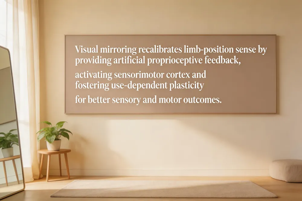 Mirror therapy (MT) taps into the brain’s natural preference for visual input—a principle known as visual dominance—to drive neuroplastic change. By reflecting the movement of the unaffected limb, MT creates the illusion that the injured or paralyzed limb is moving, which activates the mirror‑neuron system and increases cortical and spinal motor excitability. This visual‑guided motor imagery helps the brain reorganize maladaptive maps, promotes relearning of motor patterns, and can reduce pain by correcting visual‑motor mismatches.