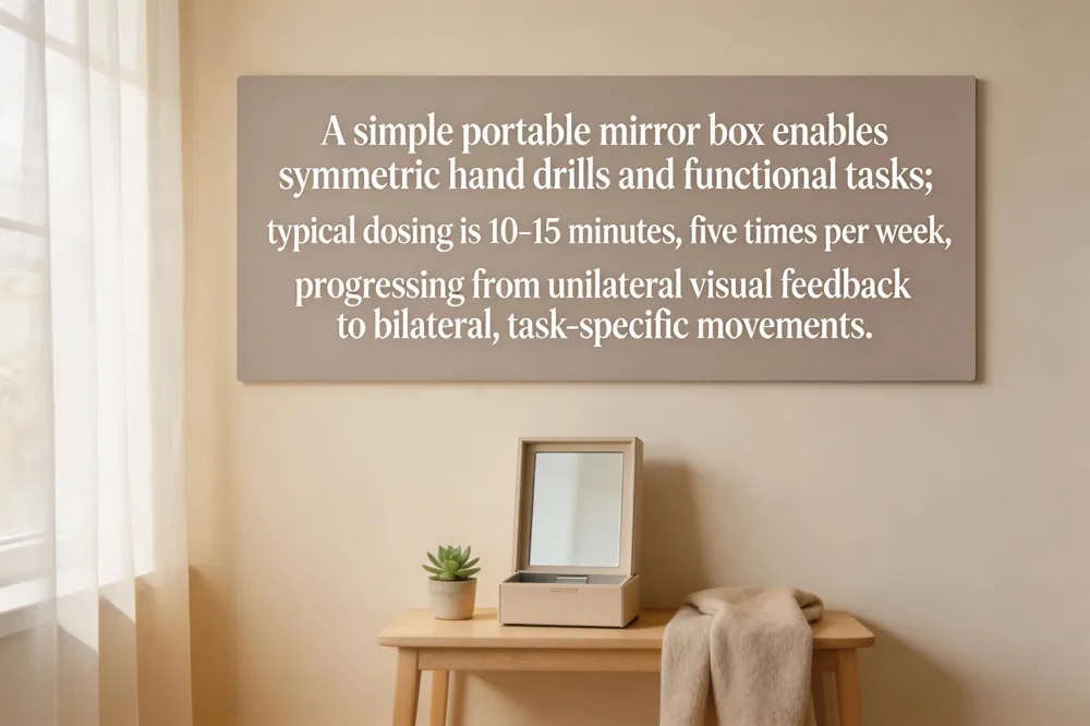 Typical dosing and session structure – Clinics usually prescribe 10‑15 minutes per session, 5 times per week for 4‑6 weeks. Sessions involve symmetric movements of the intact arm (e.g., reaching, grasping) while the patient focuses on the mirror image and keeps the affected limb hidden. Some protocols use 20‑60 minutes 104‑10 sessions per week for more intensive dosing.