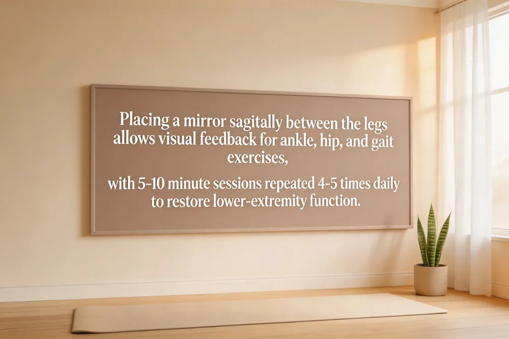 Saggital mirror placement for legs: For lower‑extremity work the mirror is positioned in the midsagittal plane, directly between the two legs. The healthy leg is placed in front of the glass while the affected leg is hidden behind it, allowing the patient to see a “virtual” version of the injured limb moving in perfect symmetry. This visual dominance helps the brain reinterpret proprioceptive signals and activate the mirror‑neuron system.