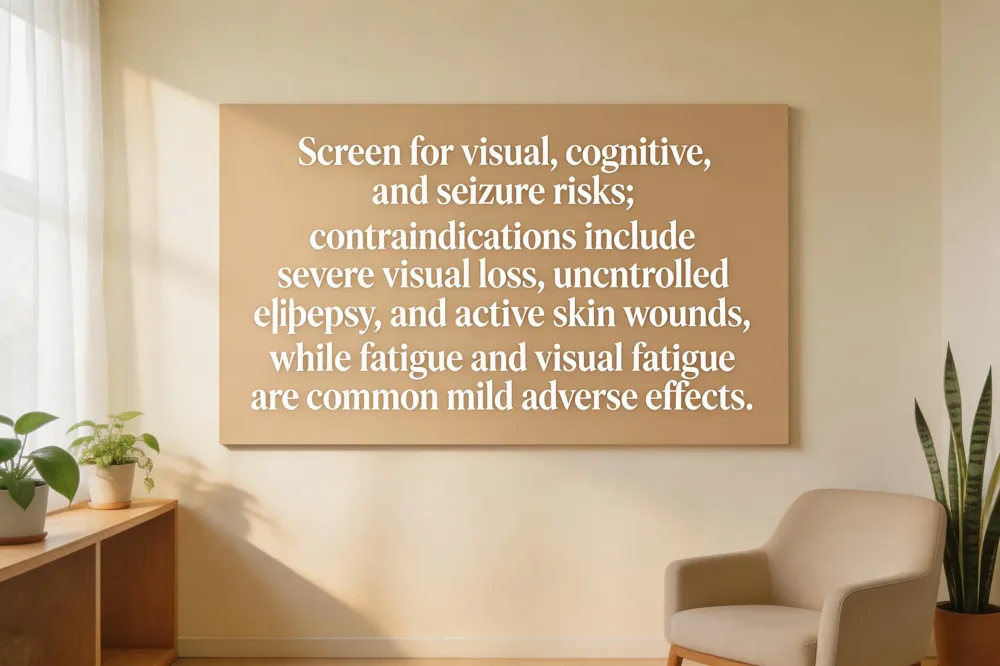 Patients with severe motor deficits, profound neglect, or extensive proprioceptive loss may derive limited benefit because the visual cue cannot fully substitute for lost motor output. Similarly, individuals with uncontrolled epilepsy, severe visual impairment, severe psychiatric conditions, or photosensitivity are generally excluded.