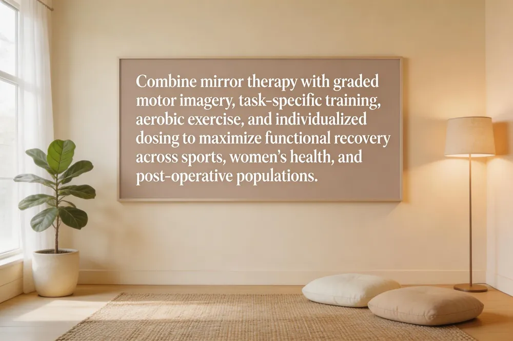 Mirror therapy (MT) is most effective when woven into a broader, patient‑centered rehabilitation plan. By pairing the visual illusion of MT with task‑specific training—such as reaching for a cup, buttoning a shirt, or throwing a ball—patients receive functional, purposeful practice that reinforces the neural pathways activated by the mirror. Adding graded motor imagery (GMI) before MT further prepares the brain: patients first practice left‑right discrimination, then explicit motor imagery, and finally the visual feedback of MT, creating a step‑wise ladder of cortical re‑education. Aerobic exercise, whether a stationary bike or a brisk walk, boosts overall circulation and neurotrophic factors, amplifying the neuroplastic gains from MT and task‑specific work.